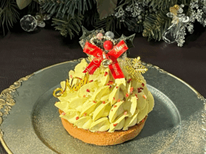 漬け込みチェリーを入れたピスタチオダマンドのタルトに、フランボワーズのジュレを合わせ、ピスタチオクリームでツリーに見立てて仕上げました。