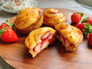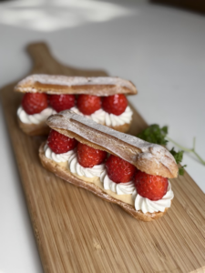 ふんわりエクレア生地にカスタードと生クリーム、丸ごと苺をごろっと贅沢に飾ったエクレアです。
